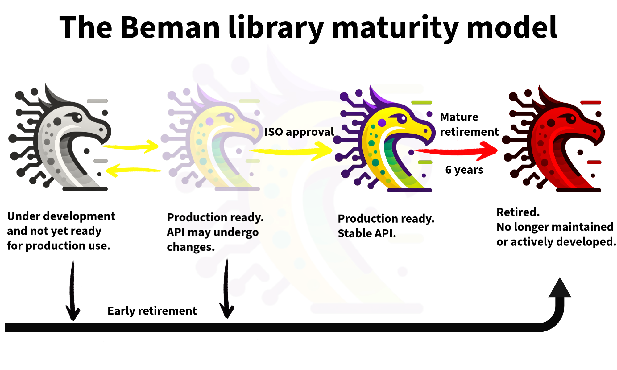 The Beman maturity model helps developers quickly assess the production readiness of Beman libraries by classifying them based on development phase and interface stability.